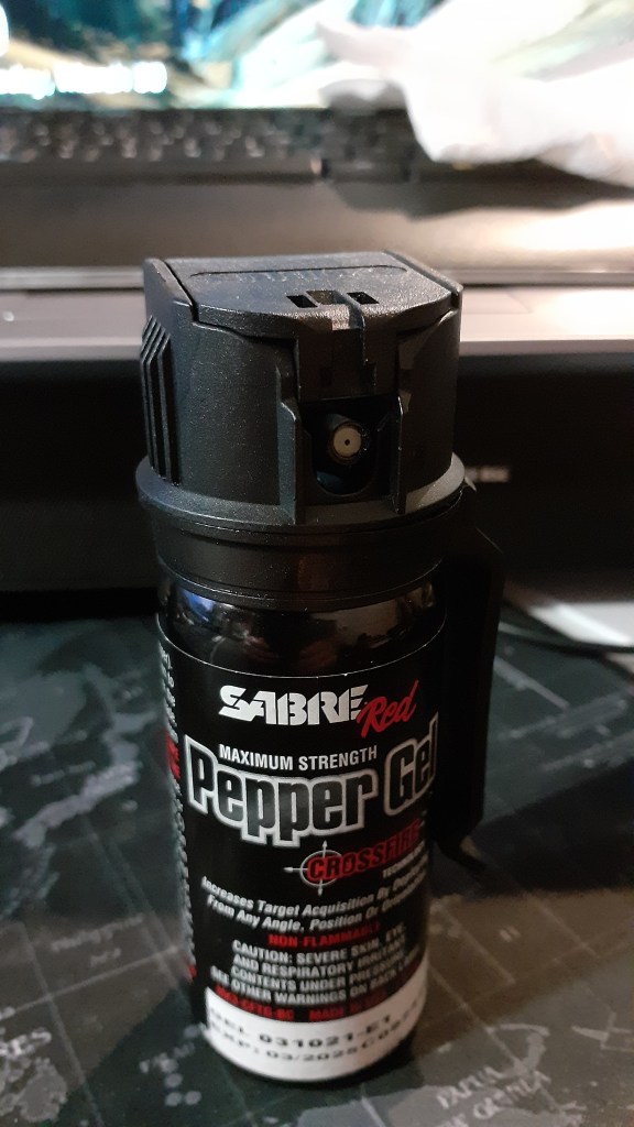 Ah… make the area less palatable! I grab my trusty Sabre Maximum Strength Oleoresin Capsicum Pepper Gel that is nearing the end of its recommended life. I’ll scare off the squirrel and spray some on the gutter to make it less appealing for the “chewing”. Maybe. Do squirrels dislike OC Pepper? About to find out.